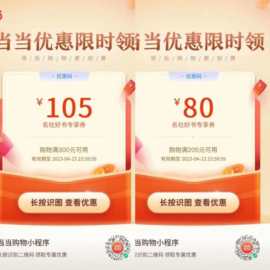 這次依依媽給大眾薅來的依然有滿300-50、滿200-25和滿150-20的自營圖書優惠碼,還有更劃算的滿300-105,滿205-80的名社好書專享券(中信、接力、小博集、海豚、浪花等出版的圖書專享。)