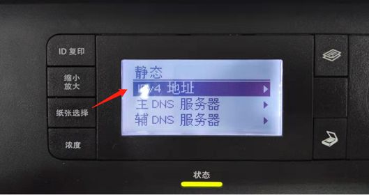 3.選取“靜態”項,按中間“ok”鍵,選取“IPv4位置”項,再按中間“ok”鍵,就可表示打印機的ip位置