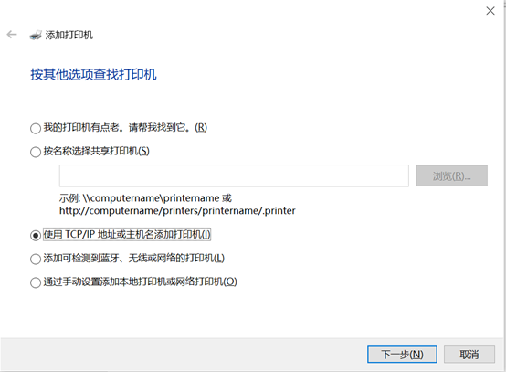 5.彈出添加打印機對話框,選取運用TCP/IP位置或主機添加打印機,點擊下一步。