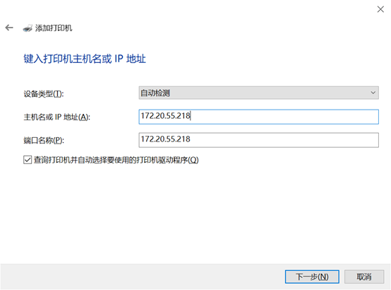6. 在主機名或ip位置中輸入想要連接的打印機的ip位置,如圖所示。